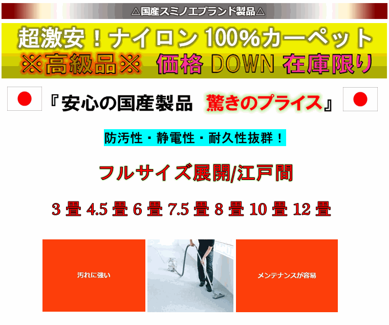 )日本製 スミノエ 高機能カーペット 【特価 フォーレス】 10畳 352×440cm 特 徴 日本製 毛足:6mm 全厚約7.5mm 毛足形状:高密度 レベルループ 素 材:高密度ナイロン100% 裏:不織布 機 能:防汚性 耐久性 摩擦性 静電性 遊び毛なしホットカーペット/床暖房対応 フリーカットOK サイズ価格表 3畳(176×261cm) ・・・・・ 7,500円 4.5畳(261×261cm) ・・・・・ 11,500円 6畳(261×352cm) ・・・・・ 13,500円 7.5畳(261×440cm) ・・・・・ 18,500円 8畳(352×352cm ) ・・・・・ 19,500円 10畳(352×440cm) ・・・・・ 25,000円 12畳(352×522cm) ・・・・・ 31,500円 プロが欲しがるナイロン100%カーペットが超特価で入荷! 最も汚れに強く掃除がラクラクで一般繊維の中で一番長く綺麗に使用が可能 磨り減りや潰れに強く掃除機は特にかけやすいのが特徴です。